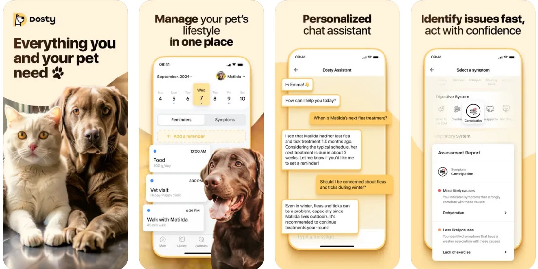 The Dosty App helps you monitor your dog’s biological age, set care reminders and access vet-backed health tips.